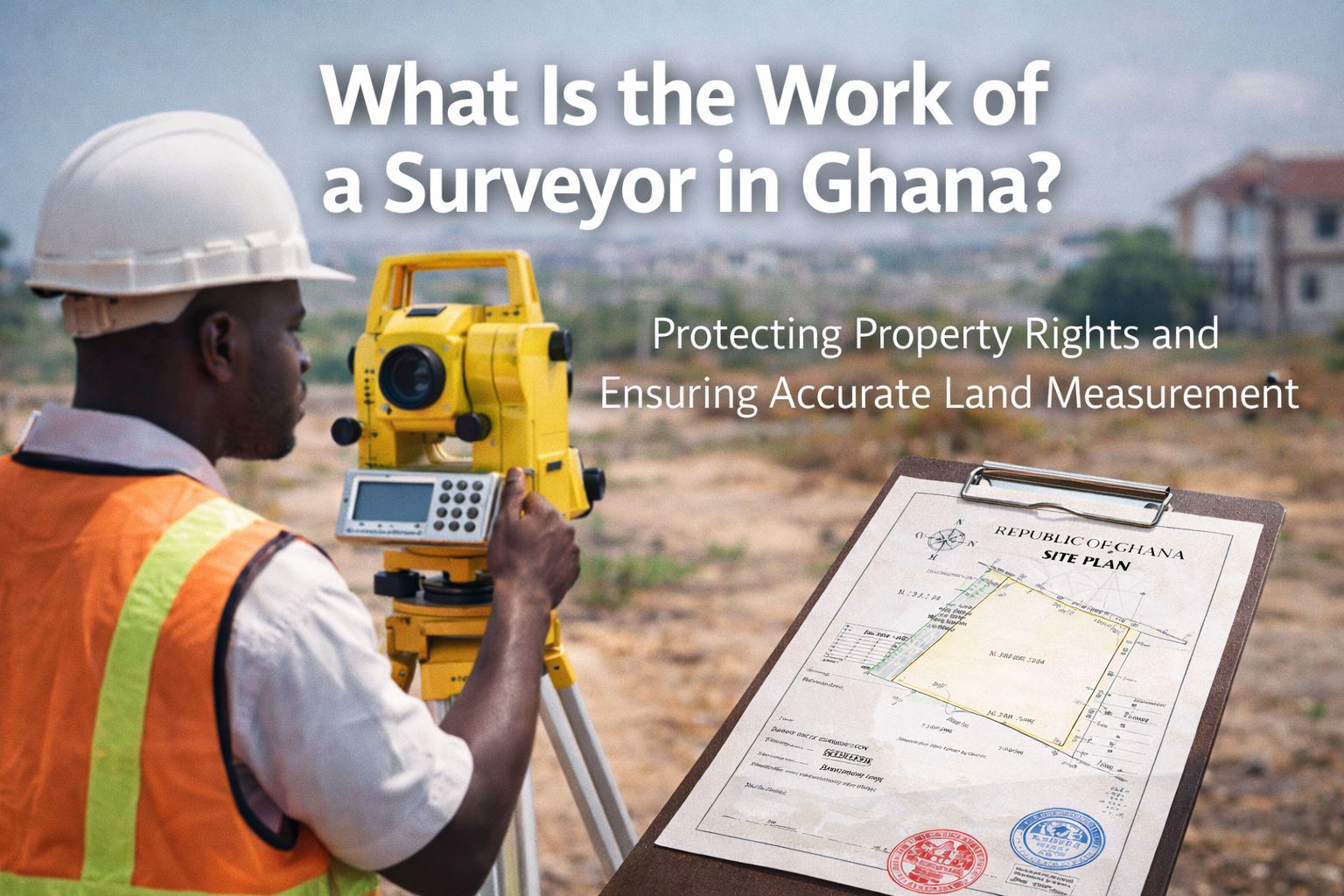 The work of a surveyor in Ghana involves measuring land, preparing site plans, preventing disputes, assisting in land registration, guiding construction, and ensuring accurate property boundaries.
